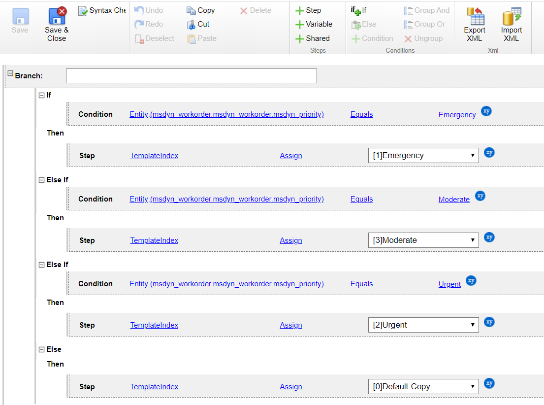 Click on the ‘If+’ button on the ribbon again, then select ‘Entity’ from the dropdown list next to condition. In the next dropdown field, select ‘(msdyn_workorder.msdyn_workorder.msdyn_priority)’. Set ‘equals’ as the next drop down, then select ‘Urgent’ from the priority statuses list.