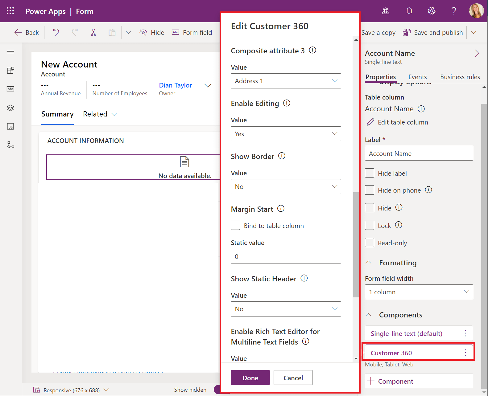 Drag the Customer 360 component on the form. You’ll notice a fly out window opens with the title ‘Edit Customer 360’. This is where you can select the fields (columns) you want to show within the component. At this time we can select up to seven simple and three composite columns on the control. Keep in mind that while you can edit most of the columns after you clicked ‘Done’, you can’t change the first column you choose. Once you configured all the columns (called attributes in the fly-out window) you’ll notice the ‘enable editing’ field. If this field is set to yes, users can edit the rows/fields that we configured earlier in this article. The ‘Show border’ allows you to configure to either show a border or not, and the ‘Margin Start’ field allows you to pick a starting margin for the control. Since I set the Show border value to ‘No’, the ‘Margin Start’ field will be ignored. Below the ‘Margin Start’ field you’ll see the ‘Show Static Header’ option. This will allow you to set a static value as the header.